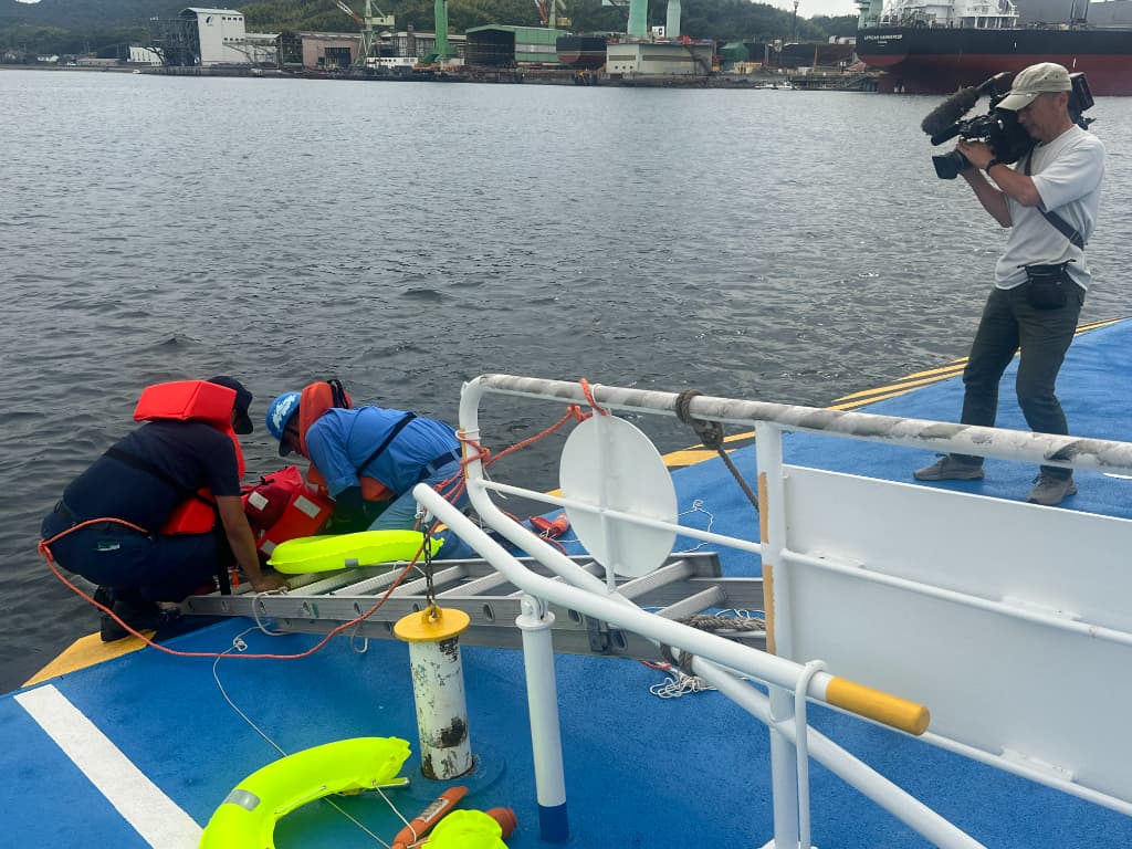 はしごを使い転落者をフェリーへ引き揚げました。