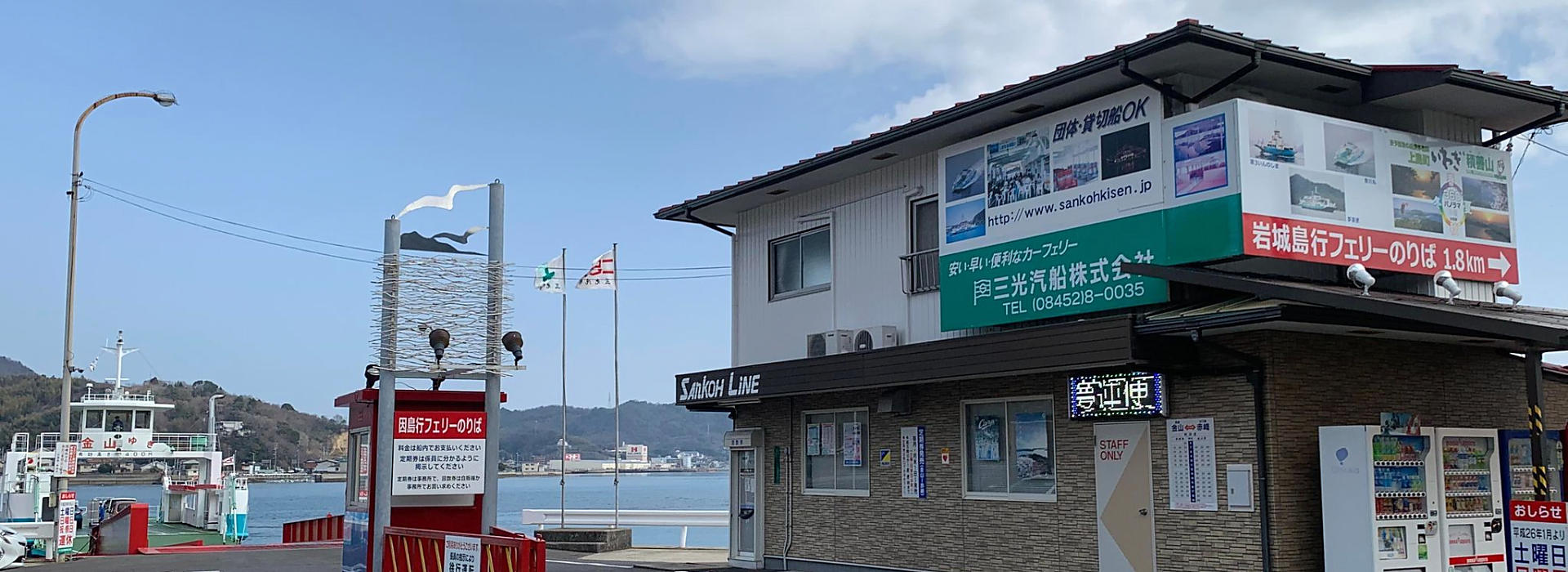 「ゆめしま海道」と書かれた青い立看板が目印です!奥へ進むとフェリーの待合室がございます。