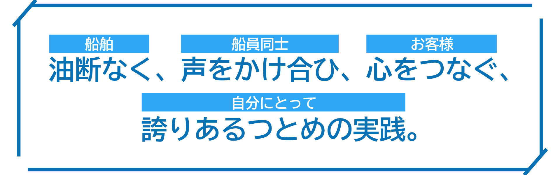 三光汽船が課題として取り組むことは今やっている安全への取り組みをどれだけレベルアップ出来るか。様々な意見や考え方を柔軟に取り入れて、どうやればお客様が安心して笑って三光汽船に乗って頂けるか。という事です。私たちは安全な航海をお客様に提供するために努力を一切惜しみません!これからも誠意新しい道を模索して参ります!